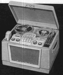 Comments: \"Dual speed deluxe. Records up to 3 hours with long-play tape. Automatic keyboard controls); index counter. FREQ. RESPONSE: 3.75 i.p.s. -- 40-7,500 +- 3DB); 7.5 i.p.s. 40-14,500 +- 3DB. WOW 0.3% Max. With microphone, radio attach. cord, tape, reels, $212.50\" (1955 advertisement)