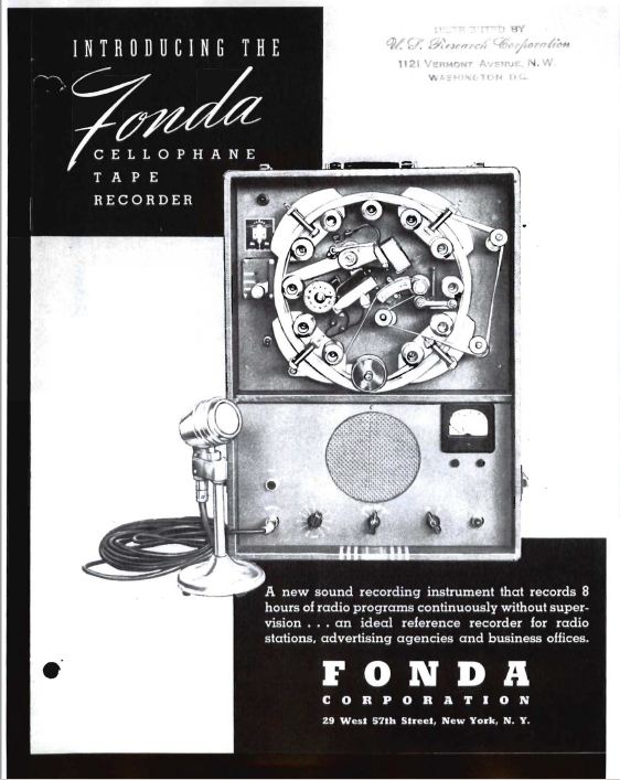 It is also not clear if there was any connection was between the Recordgraph and a similar product briefly promoted by another New Yorker named Jay Fonda–probably not. The Fonda device was also an endless-loop, plastic film, phonographic recorder, but it had a quite different mechanical design. It had an adjustable recording speed with a slow “voice recording” speed of only 40 feet per minute and a high speed of 60 fpm. Like the Recordgraph, it embossed its record onto the surface of the cellophane film. It employed a 350 foot loop of film and had a maximum recording time of eight hours. The inventor in early 1944 promoted his machine as a low-maintenance record-keeping device for monitoring purposes, to be used by airports or radio stations.