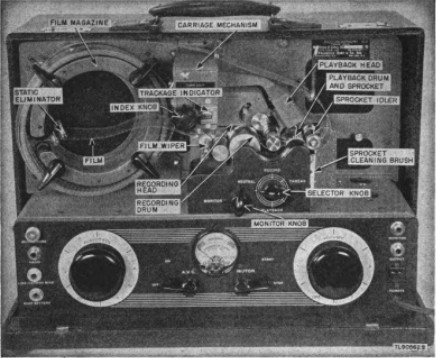 The film passed the head at a speed of 60 feet per minute (later models also had a slow speed of 40 fpm), while the position of the stylus was gradually moved by a screw mechanism, resulting in a concentric groove on the film. A standard film provided a recording time of 1.5 hours, while a special two-sided film offered three hours of recording time. Any particular groove could be accessed by moving the head manually and reading a special track counter mechanism. The instructional literature that the company provided for the U.S. Army version (the military called the Recordgraph the “Sound Recording Set AN/UNQ-1” ) claimed an overall frequency range of 150-4,000 Hz at the high speed (60 fpm), which put it roughly on par with a good quality phonograph disk recorder of the day. The military Recordgraph was able to withstand considerable shock while recording, making it suitable for portable applications in trucks, ships, and airplanes where disk recording would have been more difficult. The machines were used, for example, by reporters during the Normandy invasion.